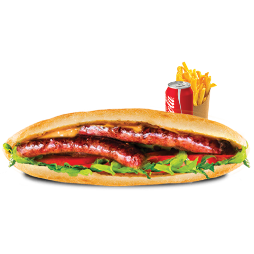 Merguez, Salade, Tomate. Servi avec une frite et une boisson à choisir.