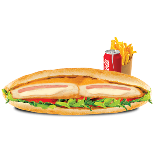 Cordon Bleu, Cheddar, Salade, Tomate. Servi avec une frite et une boisson à choisir.