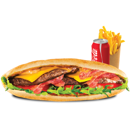 2 Steak, Baccon, Cheddar, Salade, Tomate. Servi avec une frite et une boisson à choisir.