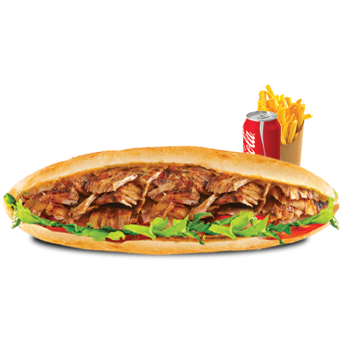 Kebab, Salade, Tomate. Servi avec une frite et une boisson à choisir.