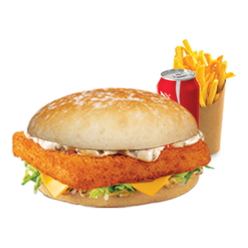 Poisson pané, cheddar, Salade, tomate. Servi avec une frite et une boisson à choisir.