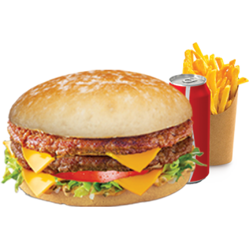 2 steak, cheddar, Salade, tomate. Servi avec une frite et une boisson à choisir.