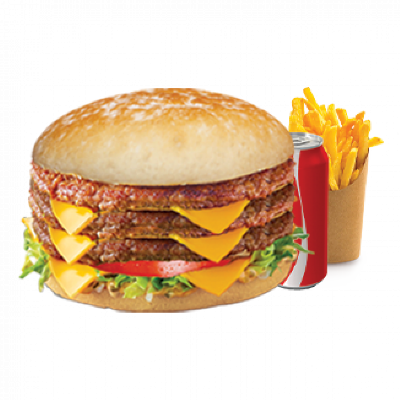 3 steak, cheddar, Salade, tomate. Servi avec une frite et une boisson à choisir.