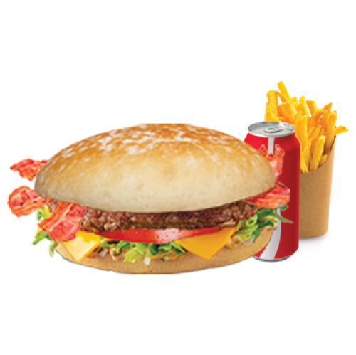 Steak, bacon, Salade, tomate. Servi avec une frite et une boisson à choisir.