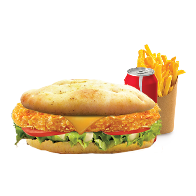 Poulet pané, Pain naan, vache qui rit, salade, tomate. Servi avec une frite et une boisson à choisir.